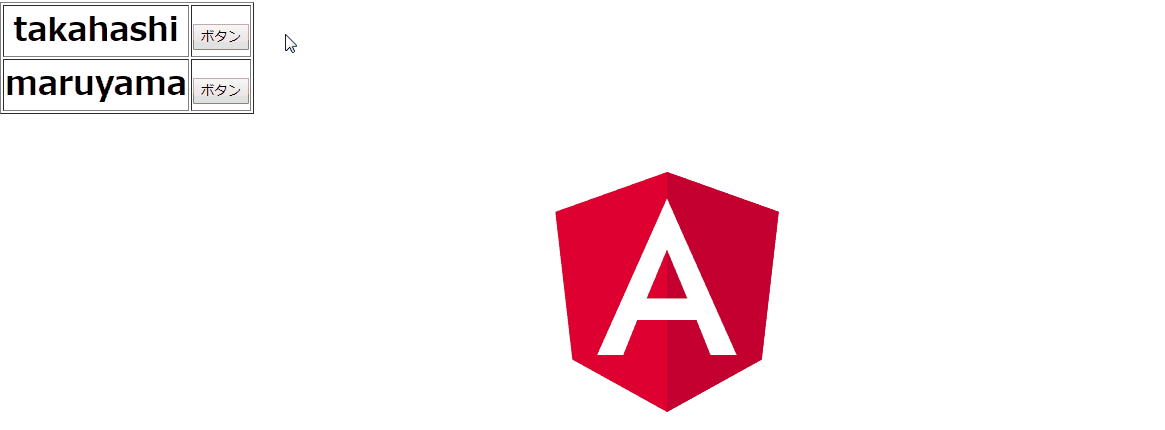 ng serveで起動すると、以下のようにクラスを介してコンポーネント間の連携が可能になります。動作は以下のようになります。