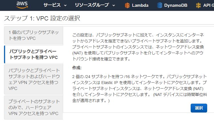 VPC作成時に「パブリックとプライベートサブネットを持つVPC」を選択して「選択」をクリックしておきます。
