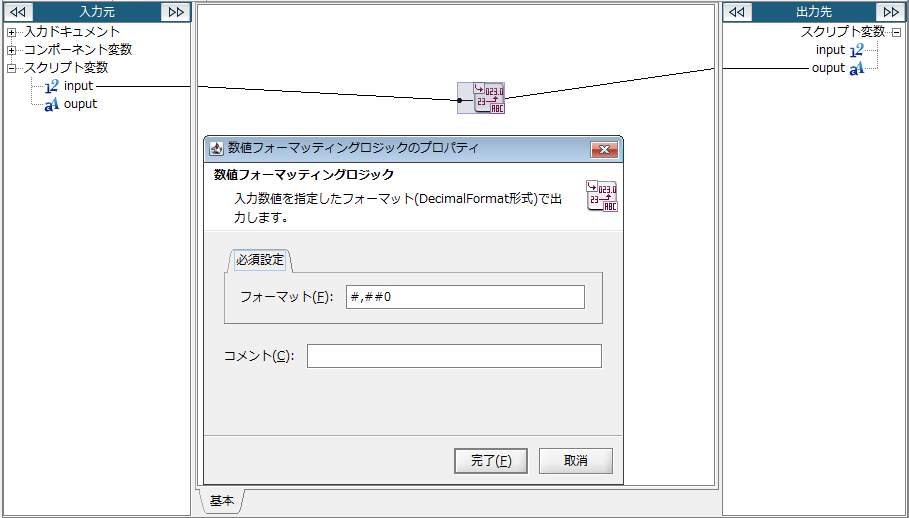 「文字列」ー「数値」ー「数値フォーマッティング」アイコンを使用してをスクリプト内にドラッグします。以下のように設定します。
