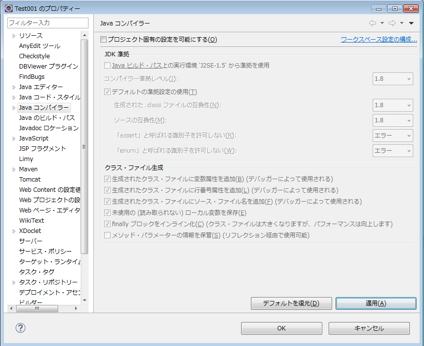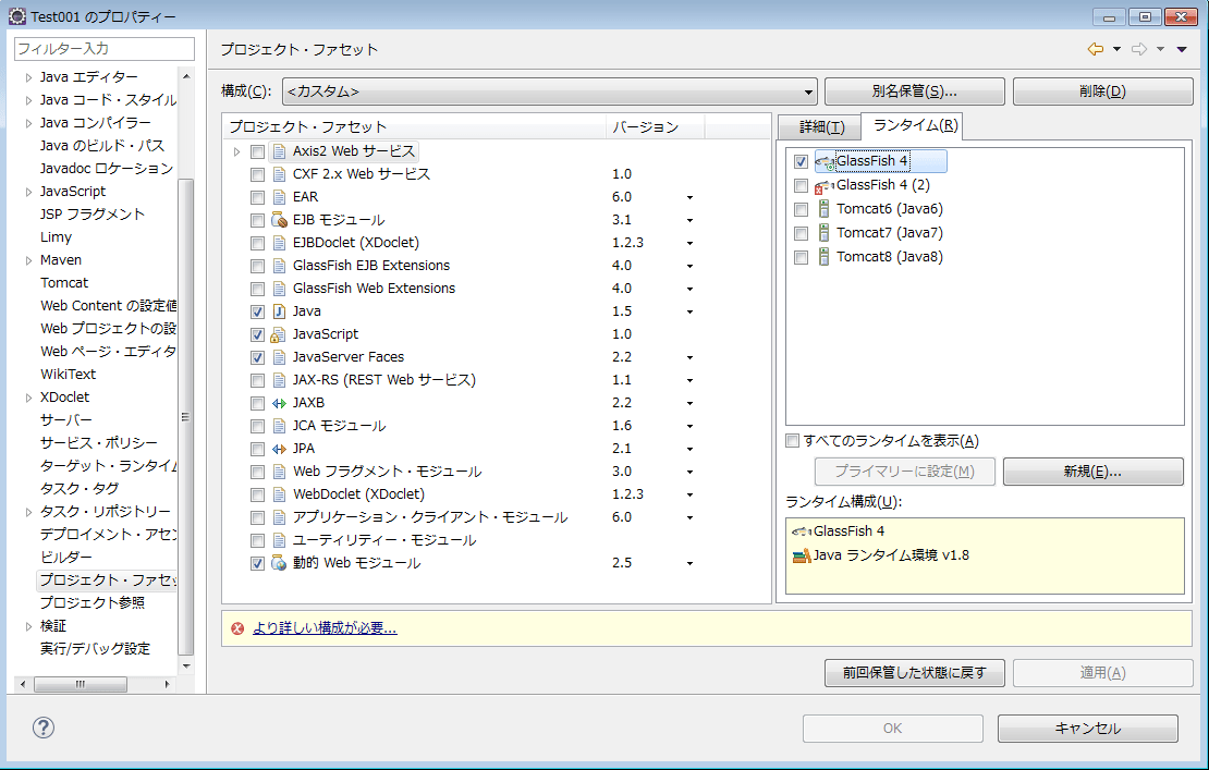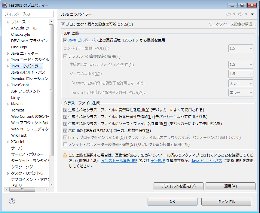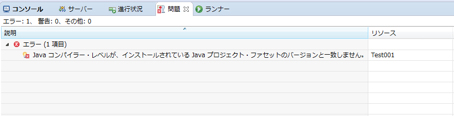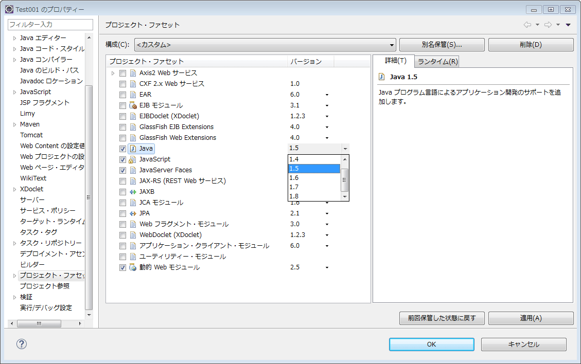 「プロジェクト・ファセット」を見ると、Javaのバージョンが1.5になっていました。
