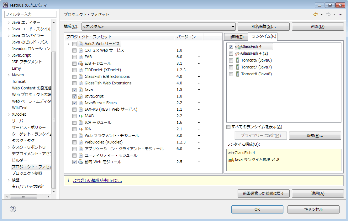 次に「ランタイム」タブをクリックし、「GlassFish 4」にチェックをいれます。