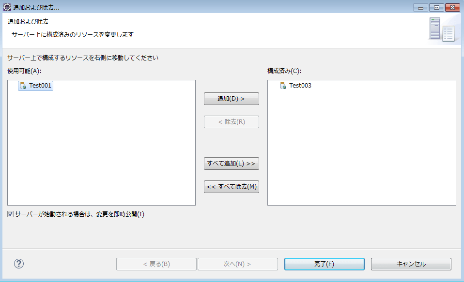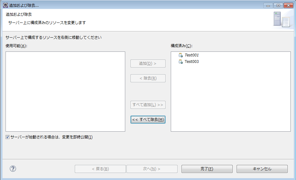 「追加および除去」を選択します。以下ウィンドウが開いたら、サーバーに追加したいリソースを追加します。