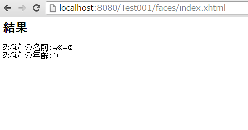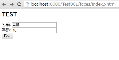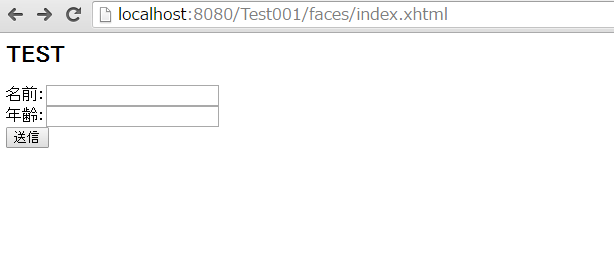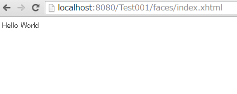 起動後、http://localhost:8080/Test001/faces/index.xhtmlにアクセスします。