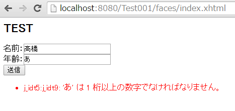 Developmentに指定した後、index.xhtmlの年齢に数値以外を入力してみてください。
