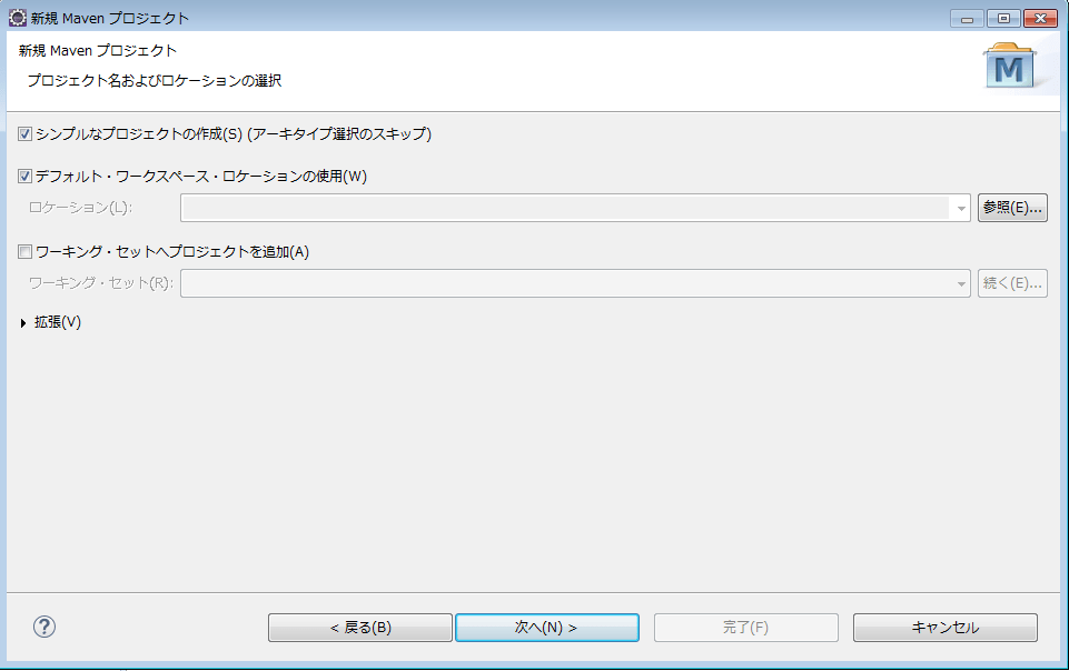 「シンプルなプロジェクトの作成」にチェックを入れて「次へ」をクリックすると、以下ウィンドウが開きます。