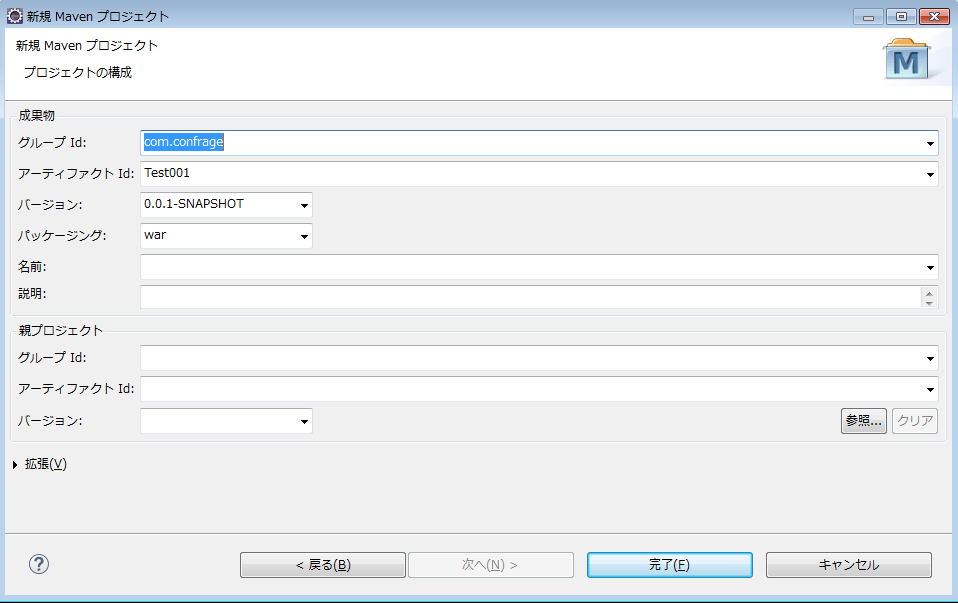 グループID、アーティファクトID、バージョン、パッケージングを入力して「完了」をクリックします。