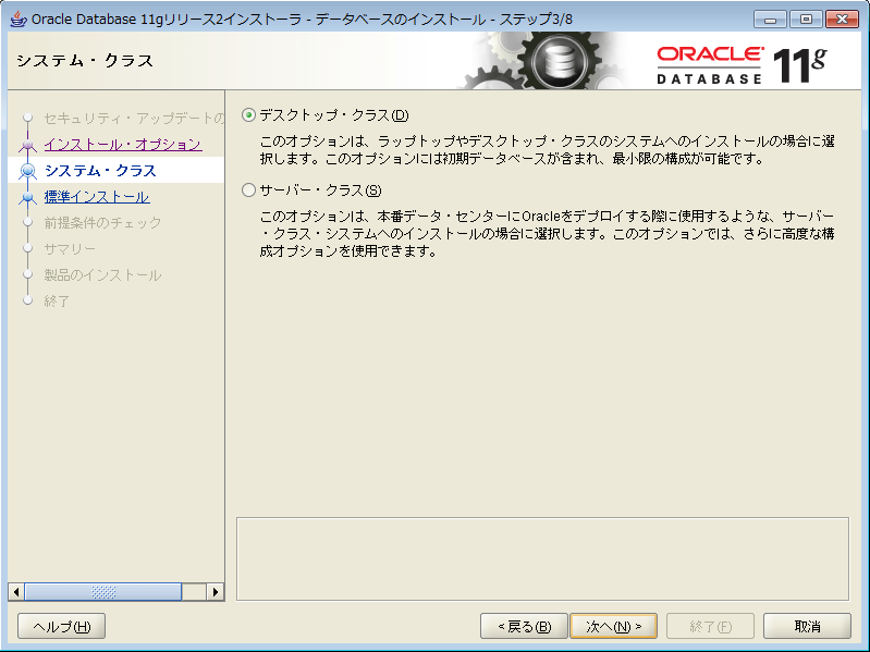 簡単なテスト用で構築する場合は「デスクトップ・クラス」を選択して「次へ」をクリックします。