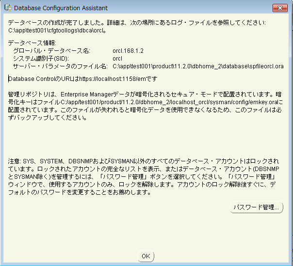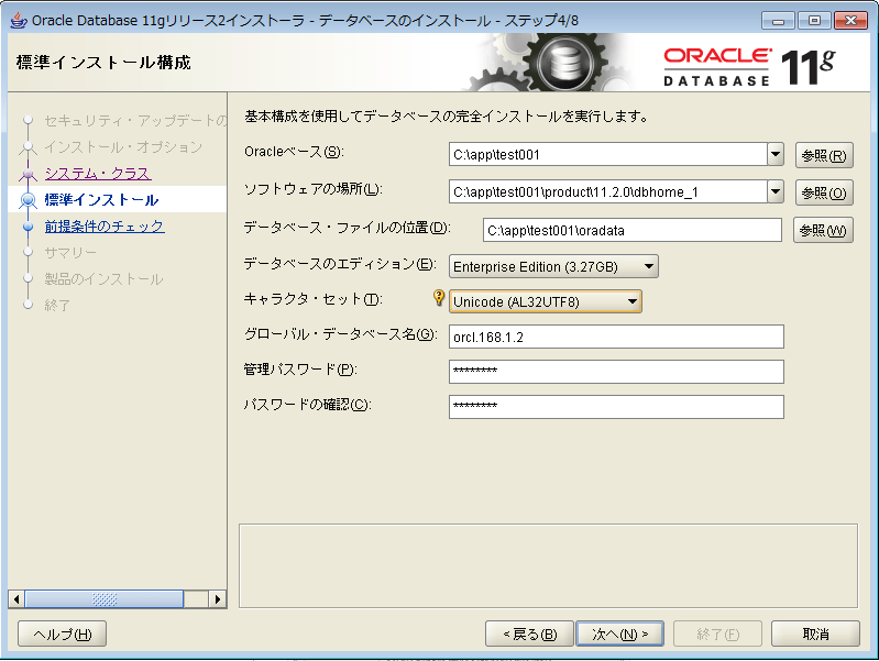 Oracleベースを指定して、任意のパスワードを入力し、「次へ」をクリックします。キャラクタ・セットは「Unicode」にしています。