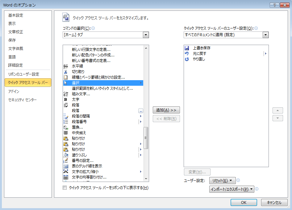 Wordのクイックアクセスバーに「選択」を表示するには、「クイックツールバーのユーザ設定」をクリックし、